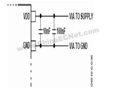 建议采用和的电容对电源去耦,每个电源引脚的去耦电容大小在0.5cm以内。注意不要把电容放在PC板ADV7189B相对的一侧,这样会影响通路中的电阻性。旁路电容应放置在电源层和电源引脚之间,使电流流经电源层、电容再到电源引脚,而不是把电源层连接在电容和电源引脚之间。一般最好的方法是在电源下放一个容值在以下的电容垫。如图2所示。